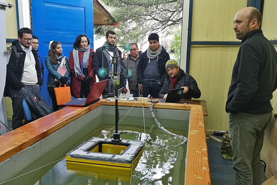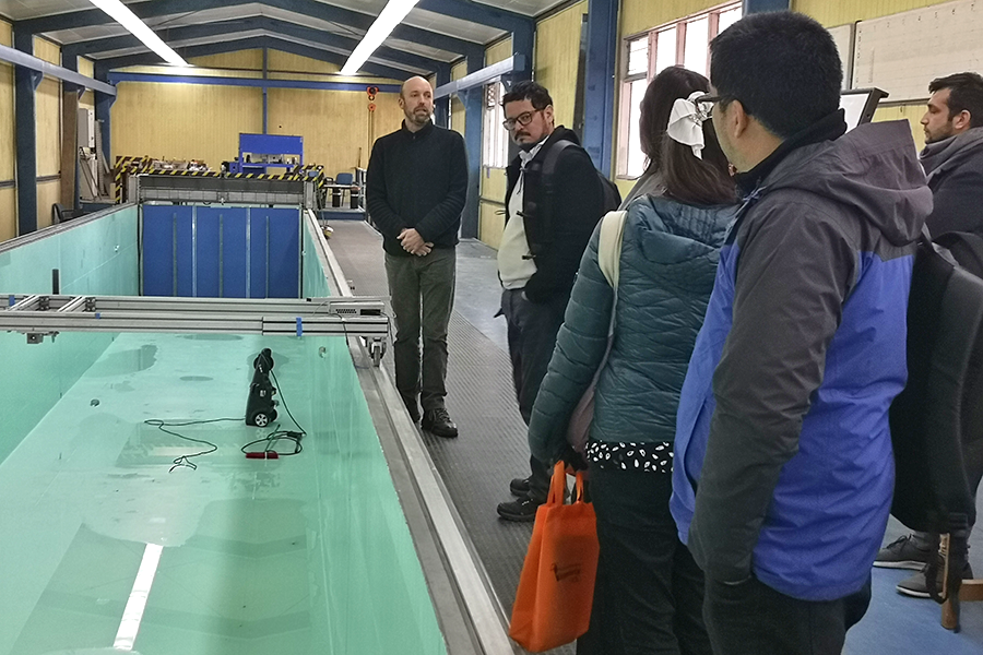La visita continuó por la tarde con algunas reuniones algunas unidades de la Facultad de Ciencias de la Ingeniería, concluyendo con una visita al Laboratorio Universitario de Fabricación Digital LeufüLab y el Canal de Ensayos Hidrodinámicos, donde fueron recibidos en este último por el Dr. Gonzalo Tampier, director del Instituto de Ciencias Navales y Marítimas.