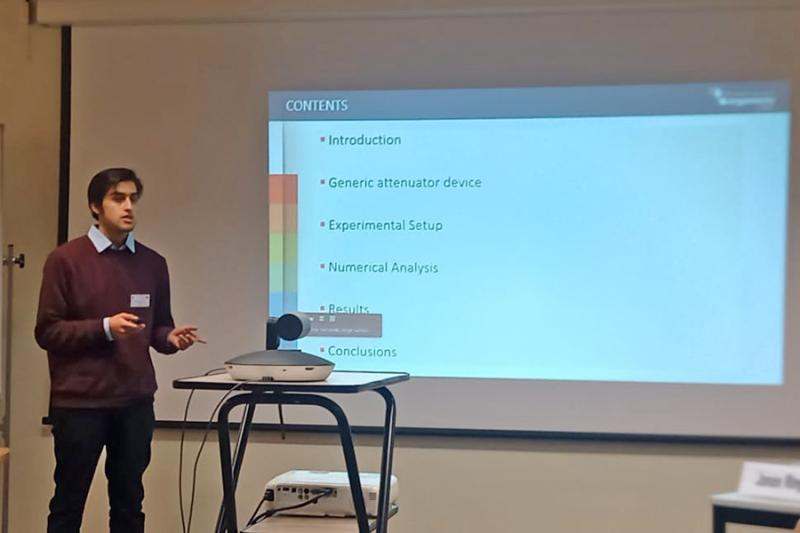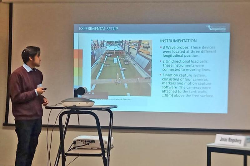 La conferencia ofrecida por el estudiante, Pablo Matamala, se denominó «Evaluación numérica y experimental del comportamiento hidrodinámico de un dispositivo convertidor de energía undimotriz articulado», y aborda el trabajo desarrollado por el joven investigador en conjunto con el estudiante de postgrado e investigador MERIC, Álvaro Gallardo, el ex investigador MERIC Carlos Parra, los académicos José Miguel Ahumada, Cristian Cifuentes y Gonzalo Tampier, y el profesional de apoyo docente, Francinet González.