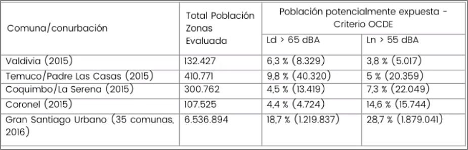 Tabla comparativa de población potencialmente expuesta a ruido ambiental