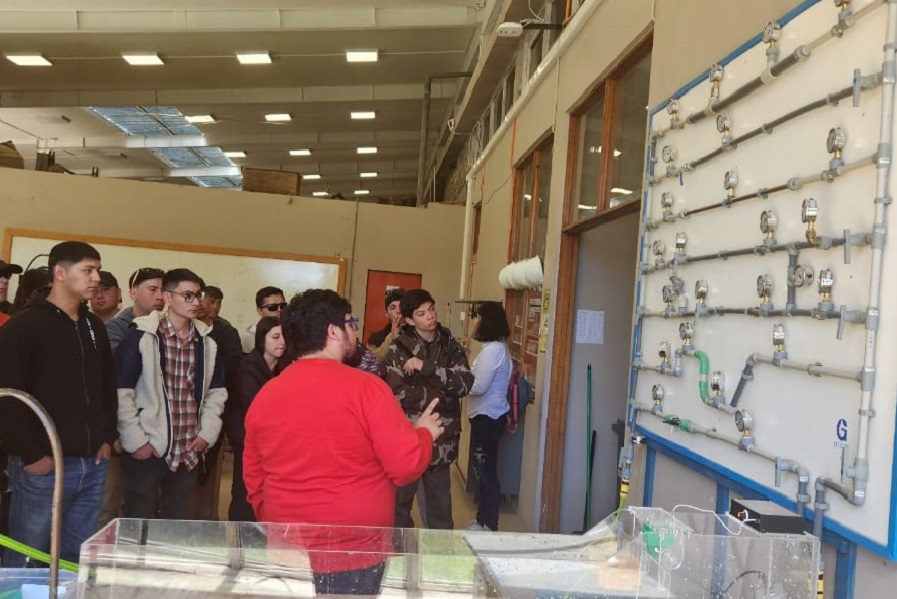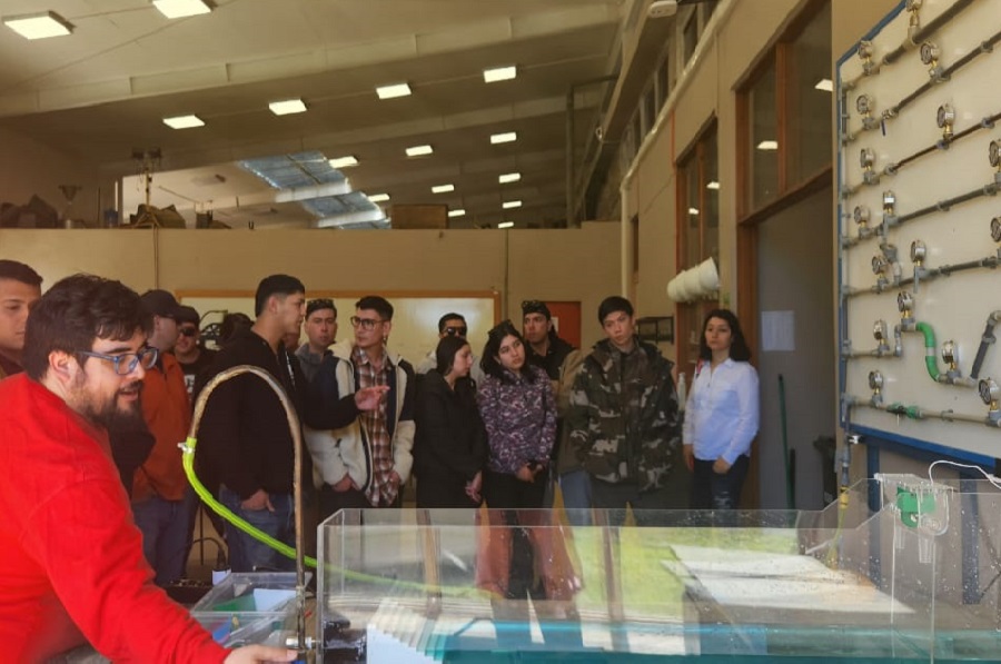 Por su parte, el Prof. García, explicó lo que conocieron los estudiantes de la UBB respecto al área hidráulica. “Hicimos un recorrido por las estaciones prácticas de los Laboratorios de Hidráulica tanto para conocimiento de canales con flujo abierto, que sirven por ejemplo para evacuación de aguas lluvia o sobrecrecidas en represas. También vimos un canal hidráulico simulador de oleaje que nos permite diseñar por ejemplo defensas costeras y finalmente el banco de pruebas de presión que nos permite diseñar sistema de tuberías al interior de edificios de varios pisos”.