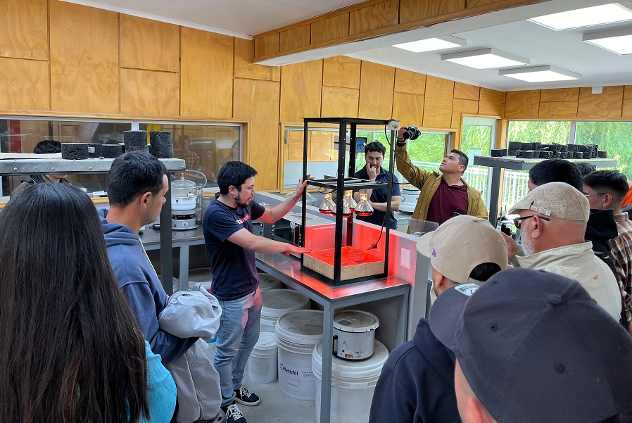 Posteriormente, visitaron el Laboratorio de Pavimentos donde los recibieron los académicos David Peña y Osvaldo Muñoz. Para finalizar, se dirigieron al Espacio 14K donde el también académico del Instituto de Obras Civiles, Dr. Galo Valdebenito les realizó una charla sobre el Puente del Canal de Chacao.